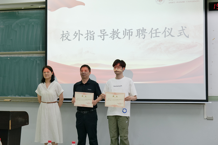 首期“新一代信息技术创新实验班” 引进双一流高校和优质企业共建开设“电子设计创新实验班”和“华为鸿蒙创新班” 两个班。邀请清华大学、中国科学技术大学等双一流高校多年从教学的教师和北京精仪达盛科技有限公司、华为技术有限公司、武汉威士讯科技有限公司、安徽芒课教育科技有限公司等企业资深工程师担任指导教师。汪莉丽副院长向北京达盛科技总经理毕才术和华为鸿蒙开发认证工程师、高级讲师李晟颁发了“校外创新创业指导教师”聘书。