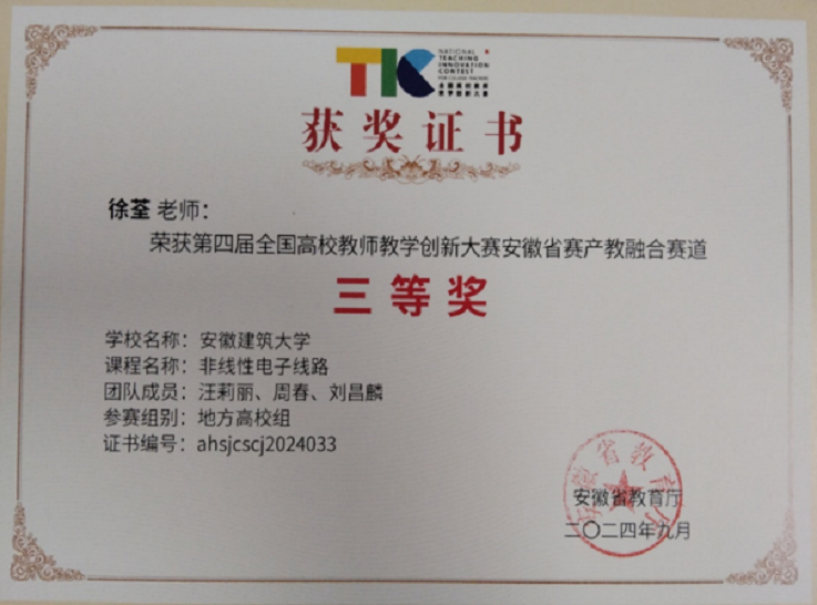 本届大赛安徽省赛由安徽省教育厅主办、安徽财经大学承办。以“推动教学创新 培养一流人才”为主题,按照“四新”建设、基础课程、课程思政、产教融合等领域设7个大组,设置了网络评审与现场赛两个环节,其中课堂教学实录视频、课程教学创新成果报告为网络评审,课程教学设计创新汇报为现场赛。电信学院汪淼教师(团队)获得新工科中级及以下组二等奖、徐荃教师(团队)获得产教融合赛道三等奖。