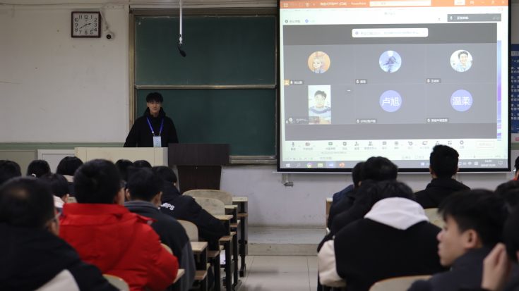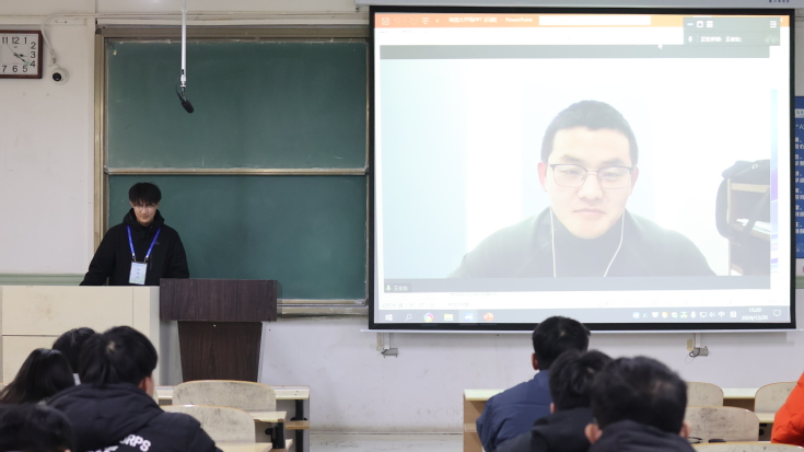 在主题分享环节,来自不同学科领域的3位优秀研究生代表通过腾讯会议空中连线电信学院学子。他们不仅是学业上一等奖学金获得者,也是优秀研究生干部、优秀共青团员等称号获得者,并且在自己的研究方向上做出了一定的成果。每位分享者都结合自己的亲身经历,从联合培养的校园生活、科研方法、时间管理、职业规划,考研经验分享等多个维度,为在场的同学们细致讲解,提供了宝贵的经验。