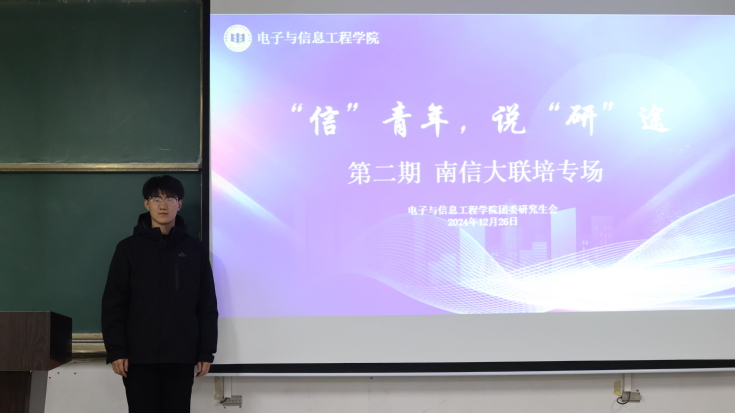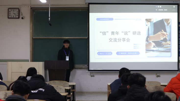 本网讯 12月26日下午,电子与信息工程学院团委在主教楼智慧教室1409举办了第二期“信”青年说“研途”|榜样引领优秀研究生代表经验分享交流会,本次活动由学院研究生会办,邀请了学校与南京信息工程大学联合培养的3位优秀研究生代表参与分享交流,通过线上线下相结合的方式,让在校本科生、研究生与优秀研究生学长交流,分享考研学习经验、研究生阶段学术研究与学术心得、学期阶段规划,研究生生活及未来职业规划得等方面的宝贵经验。活动由学院研究生团委负责人刘国庆主持,共100余名研究生、本科生参加此次活动。