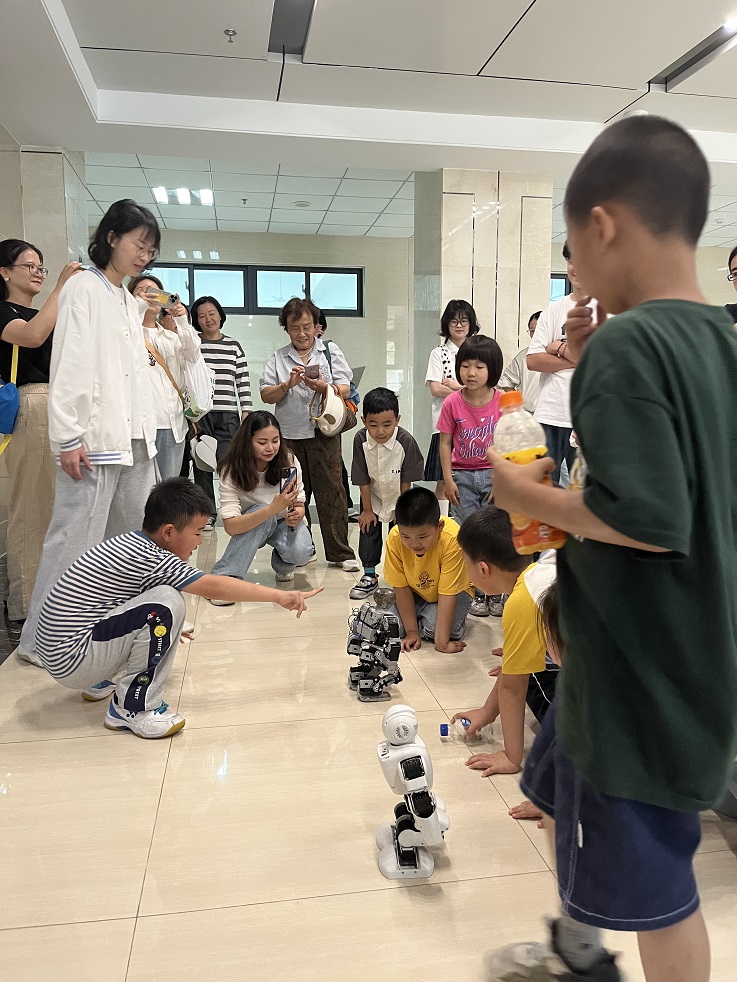 在现代化实验中心,小朋友们观看机器人舞蹈表演,精准的动作引发欢呼。随后,他们被分组操控机器人,通过触控面板实现指令操作,亲身感受科技的趣味性与操控感。