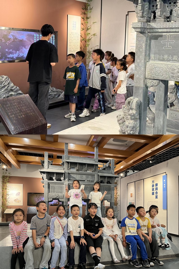 在徽派建筑博物馆,通过沙盘模型与投影动画,生动向小朋友们解读“依山就势、粉墙黛瓦”的建筑理念。小朋友们围聚在天井模型旁,聆听“四水归堂”设计中蕴含的徽商文化与“天人合一”哲学思想,对马头墙“防火御灾”的实用功能与飞檐翘角的美学价值表示惊叹。在木雕、石雕、砖雕展区,党员教师引导队员观察“三雕”工艺的细腻纹路,讲解“徽匠精神”中“追求极致、精益求精”的内涵,部分小朋友在允许下触摸复制品,近距离感受传统技艺的温度。