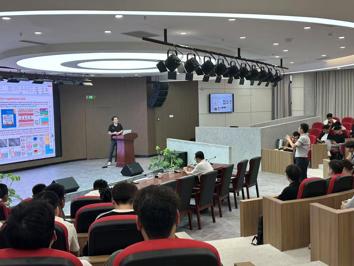 周安楠教授围绕非饱和土水力-力学耦合模型、实验验证、城市灾害模拟等方面展开阐述,结合自身团队在非饱和膨胀土、流体力学耦合及地质风险评估方面的成果,展示了模型在预测地下管道渗漏导致地面塌陷中的关键作用。周安楠教授的报告内容系统而前沿,师生们认真聆听、反响热烈。在互动环节,多位师生积极提问,如针对模型在真实工程中的适用性、非饱和土本构模型的优化方向等问题,周教授耐心解答,现场学术氛围活跃融洽。随后,张宁教授进行总结发言,高度评价了周安楠教授的分享成果,并代表学院衷心感谢其带来的国际视野和科研启示。