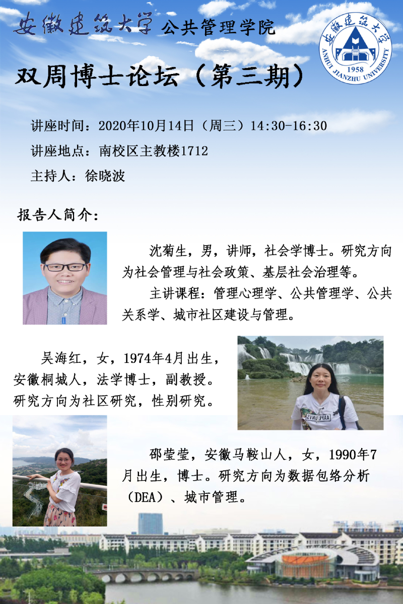 本网讯  1014日,公管学院在南校区主教楼1712会议室开展2020-2021学年第三期“双周博士论坛”,沈菊生、吴海红、邵莹莹三位博士分享自身的最新研究成果,学院全体青年博士、研究生参加本次论坛,论坛由徐晓波副教授主持。