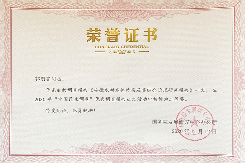 2018级城市管理专业郭明雯同学撰写的《安徽农村水体污染及其综合治理研究报告》一文获优秀调查报告二等奖,2018级城市管理专业许东辉、吴春宏同学撰写的《教育——乡村振兴的未来》、陈阳阳同学撰写的《坚韧生长:疫情下的农户就业》两份报告获三等奖。袁海枫、李敏、刘可榕等13位同学获得国务院发展研究中心办公厅颁发的“优秀调查员”称号