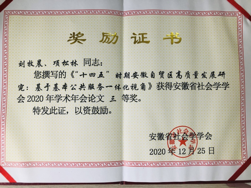 在论文评选环节,沈菊生《基于社会治理视角的违建整治研究——以S村为例》一文获得优秀论文二等奖,刘牧晨《“十四五”时期安徽自贸区高质量发展研究:基于基本公共服务一体化视角》一文获得优秀论文三等奖。