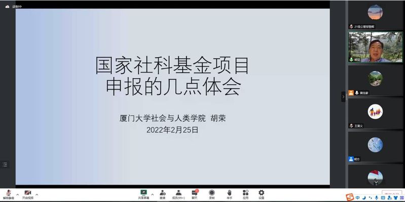 本网讯  进一步推进学院国家社科基金项目申报工作,提高学院师生科研创新能力,公管学院于11月9日线上举办了公共管理高峰论坛(第2期)。本次论坛邀请了教育部特聘教授、国家社科基金会评专家、厦门大学社会与人类学院院长胡荣教授做题为“国家社科基金项目申报对话与分享”的学术讲座。学院教师、研究生以及内外兄弟院校师生共200余人参加论坛由院长黄佳豪主持。