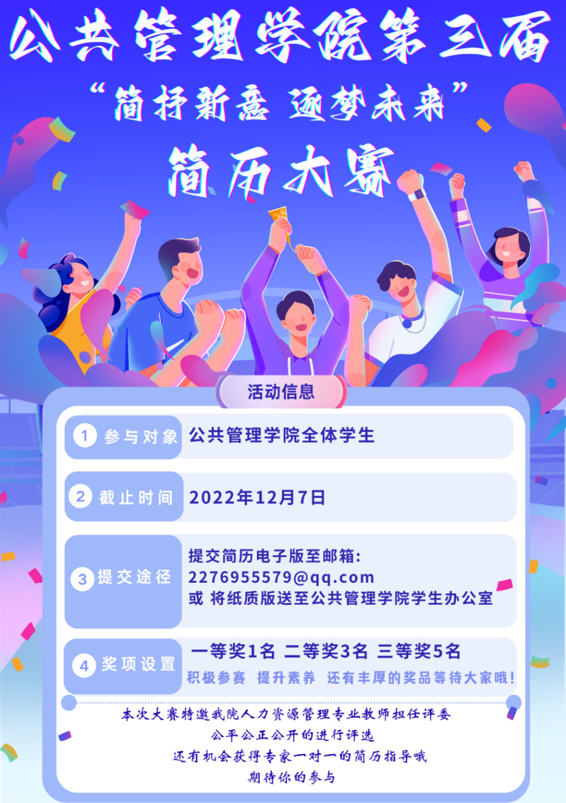 本网讯  为提升我院毕业生求职技能,提高简历制作水平,进一步增强求职竞争力,公管学院12月初启动第三届“简抒心意,逐梦未来”简历设计大赛。