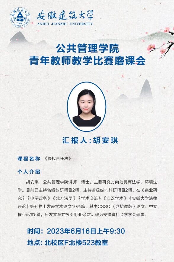 本次磨课活动按照安徽省青教赛赛制要求进行,评委专家随机从参赛教师的备赛片段中抽取,教师由此展开教学。青年教师胡安琪博士完整汇报了《侵权责任法》课程教学片段“见义勇为情形下的民事责任承担”,以现实案例进行课堂导入、以古今法条演变展开知识讲解、以师生研讨探析法条应用,鞭辟入里,入木三分。