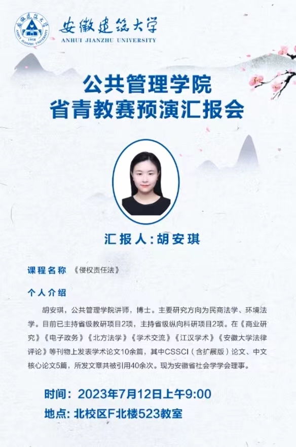 本网讯 为进一步提升学院青年教师的赛课能力,检验阶段化备赛成果,帮助学院青年教师进一步打磨参赛课程,塑造学院“以赛促教,以赛促建”氛围,2023712日上午,公管学院在F523教室开展安徽省青年教师课堂教学比赛预演汇报活动。安徽大学教务处白琳副处长、商学院刘金培教授以及公管学院黄佳豪院长、陈松林教授、范海洲教授、程家福教授等担任指导专家,学院督导组成员及相关教师参与观摩,学院副院长连瑞瑞主持会议。