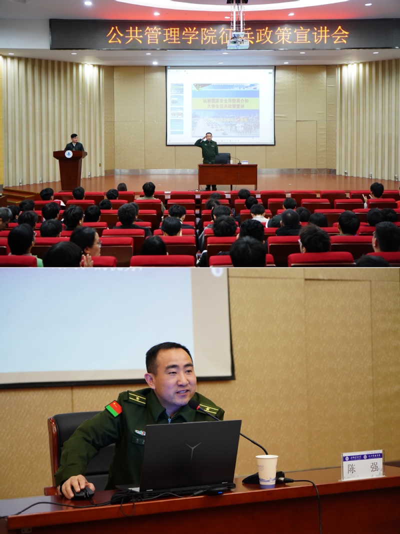 本网讯  为加强学生爱国主义教育,深入宣传国家征兵政策,3月21日,公管学院在北区图书馆二楼报告厅开展征兵政策宣讲会,宣讲会邀请合肥市包河区人武部军事科科长陈强担任主讲,学院辅导员代表及200余名同学聆听此次宣讲会。