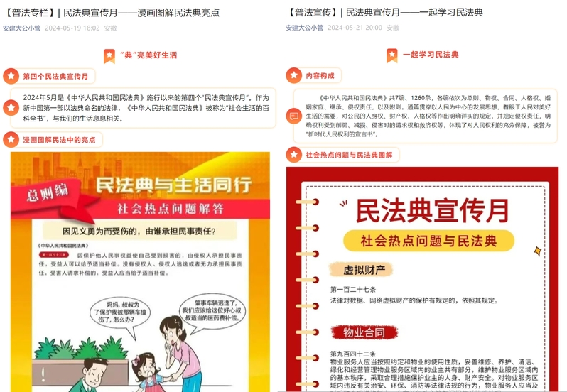 为进一步扩大普法宣传覆盖面,学院还通过“安建大公小管”公众号开设【普法专栏】|民法典宣传月主题专栏进行线上宣传,分别从漫画图解、亮点解读、诞生经过等不同角度发送推文对民法典知识进行解读,以漫画、视频以及文字分享等多样的形式吸引同学们观看阅读。