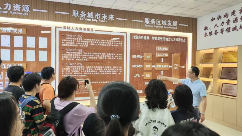 随后,师生们来到环安人才人力资源市场通过负责人介绍,同学们了解到环安人才人力资源市场深耕人力资源服务,全方位体现“专业化”服务、“数字化”转型、“生态化”打造、“一站式”方案习近平总书记强调,“加快构建实体经济、科技创新、现代金融、人力资源协同发展的产业体系,在人力资本服务等领域培育新增长点、形成新动能。” 通过参观交流,同学们不仅对对池州市的人力资源市场经济社会发展有了一定认知也对当前社会的工龄结构以及社会分工状况并有了深刻见解,同时激发了大家对个人职业生涯规划的深度思考