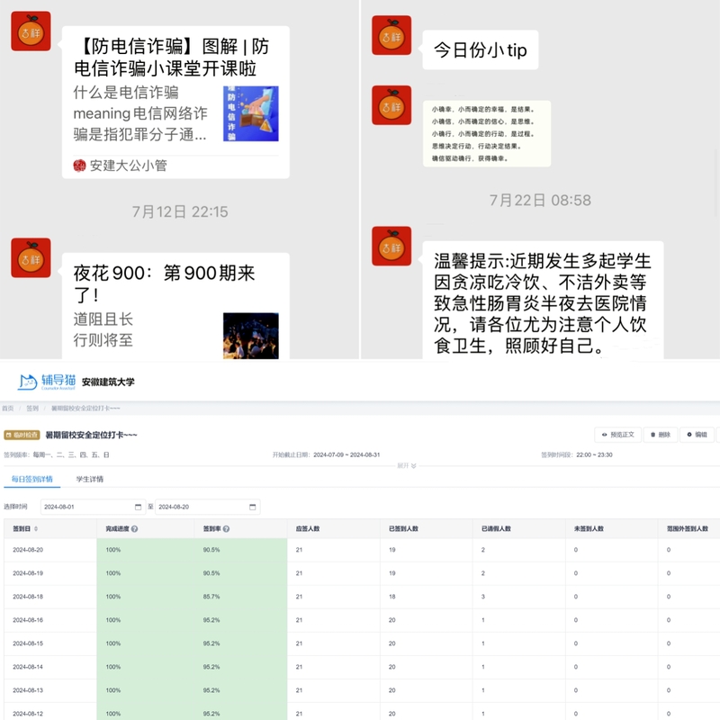 同时,为切实做好学生教育、管理与服务工作,辅导员每天通过QQ群、今日校园等方式加强对留校学生情况的动态管理,细心服务,为留校学生考研备考营造一个安全、文明、有序的学习环境。