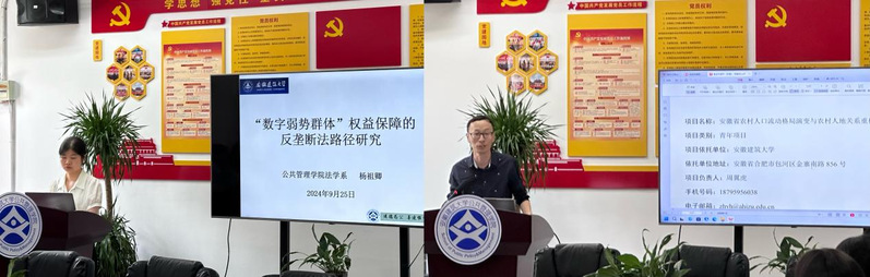 杨祖卿以《“数字弱势群体”权益保障的反垄断法路径研究》为主题,从风险透视、理论基础、价值选择三个方面剖析了数字时代背景下弱势群体的权益现状与挑战。指出,反垄断法作为维护市场竞争秩序、促进公平正义的重要法律工具,在保障数字弱势群体权益方面大有可为。周翼虎以《安徽省农村人口流动格局演变与人地关系重构研究》为主题,安徽省农村人口的流动行为在时间和空间上的特征和发展历程对安徽省农村土地利用造成的影响如何通过差别化的政策设计对农村人地关系进行重新构建这三个部分渐进式进行阐述分享。