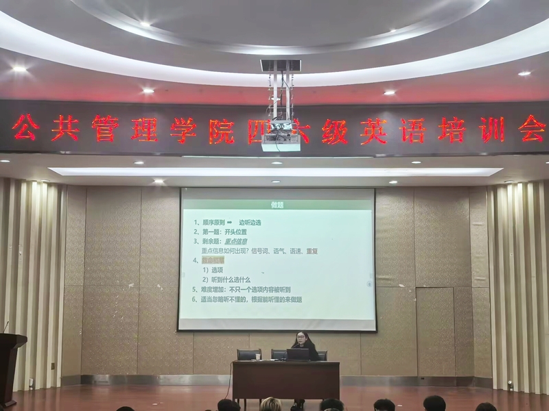 本网讯 为进一步加强学风建设,帮助学生高效备考大学英语四六级考试,提升学生英语素养和应试能力。11月6日-7日,公管学院在金寨路校区图书馆2楼报告厅举办四六级英语培训会。培训会邀请新东方四六级培训师何蕊进行授课,针对四六级考试的各项重点内容进行了详细讲解。