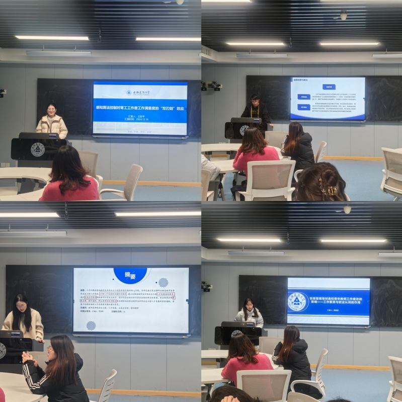 在汇报环节,王新蕾以《安徽省城市生命线安全工程人才发展影响因素研究》为题,针对安徽省城市生命线安全工程人才发展提出了建议;王彩平以《感知算法控制对零工工作者工作满意度的“双刃剑”效应》为题,基于认知动机双重视角,构建双链式中介模型进行问卷调查,为有序构建我国零工经济市场的和谐劳动关系提供实践启示;薛银银以《包容型领导对高校青年教师工作绩效的影响——工作繁荣与职业认同的作用》为题,从领导风格角度出发,对教师人力资源管理给予启示,为工作繁荣的实现路径提供了新的视角;刘翔宇以《安徽省县城城镇化水平分异特征及影响因素分析》为题,运用熵权法、空间数据分析等手段探究安徽省县城存在的差异,并针对性地提出差异化的发展策略。