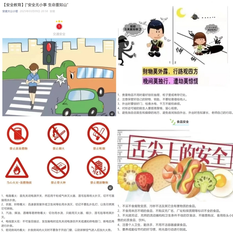 同时,充分利用学院微信公众号“安建大公小管”,持续开展安全教育宣传活动,定期推送涵盖消防安全知识、防诈骗技巧、网络安全常识等内容的推文,以生动案例、漫画解读等形式,增强学生安全防范意识,引导学生树立正确安全观念,营造安全稳定的校园氛围。
