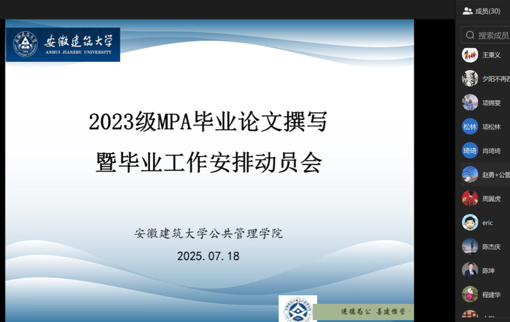 本网讯 为切实提升MPA研究生学位论文质量,规范写作流程,7月18日,公管学院线上召开2023级MPA毕业论文撰写暨毕业工作安排动员会。会议由副院长王秉义主持,院长黄佳豪、2023级MPA研究生及导师参加会议。