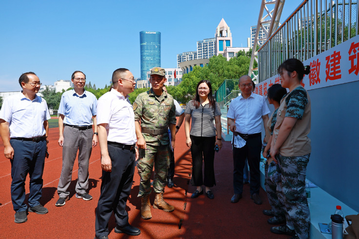 “是不是中暑了?有没有及时喝解暑药?”看到场边休息区有几位同学因体力不支暂时休整,领导们走上前询问学生的身体状况,叮嘱学生及时补充水分、静心休整。校领导和老师的关心让同学们倍感温暖,纷纷表示将以饱满的热情投入军训,以良好的风貌开启大学生活。
