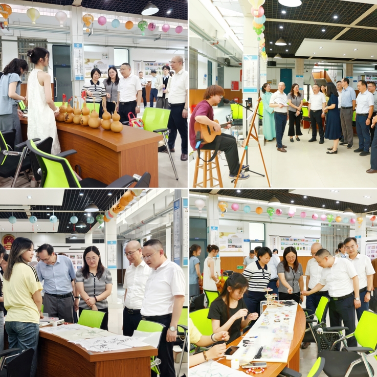 高跃峰一行走访建树楼一楼学生社团活动中心,看了朝含国学制作的发簪工艺品、书法作品、非物质文化遗产——葫芦烙画,聆听了传韵戏曲美育工作室和嘻哈研究社同学们的精彩演唱。他认真听取社团负责人对社团特色和活动开展情况的介绍,对各社团丰富校园文化、提升校园文化底蕴方面作出的贡献,给予了高度认可与充分肯定。