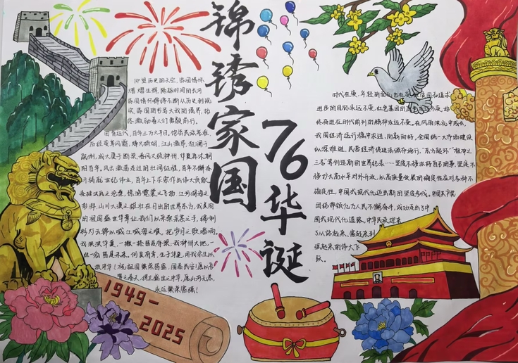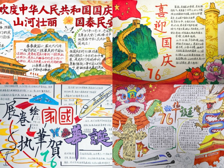比赛中,同学们创意迭出、佳作频现。马苗苗同学的作品《锦绣家国,76华诞》,以细腻的笔触、鲜明的色彩勾勒出祖国76年来的发展巨变,凭借其深刻的主题内涵与精湛的制作工艺荣获一等奖成为大赛中的一大亮点。洪卓博的《欢度国庆》、张晰月的《山河万里盛世华诞》、翁锦晏的《喜迎国庆,绘梦山河》以及武昱畅的《祝福祖国76华诞》、张梦楠的《庆贺祖国76华诞》等作品也表现出色,分别斩获二等奖、三等奖及优秀奖。这些作品或展现祖国的壮丽山河,或回顾国庆的喜庆氛围,或讴歌祖国的繁荣昌盛,从不同角度诠释了对祖国的深情告白。