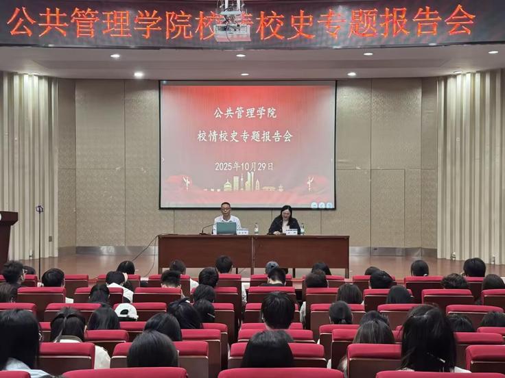 本网讯 10月29日,增强爱校荣校意识,加深新生对学校及学院发展历程的了解,公管学院在图书馆二楼报告厅举办“校情校史、院情院史”专题教育活动,活动由学院党委副书记(主持工作)汤娜主持,校党委常委、宣传部部长徐庚阳、学院院长黄佳豪担任主讲。