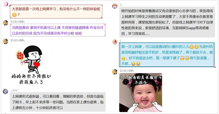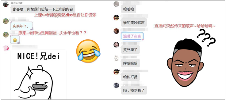 功夫不负有心人,在老师和同学们的协调配合下,网课正如火如荼的进行着。尽管一切渐入佳境,但前期由于平台拥堵与操作不熟等问题,还是闹出了很多可爱又美好的“翻车”瞬间:当同学们还在紧张又兴奋的准备与主播连麦时,却发现“网络主播”早已不在直播间,被迫下线,上着上着老师不见了,有点慌;上课时不知是哪位熊孩子没关麦,屏幕的那端竟传来“是谁在唱歌、温暖了寂寞…”的美妙歌声,弄得大家啼笑皆非;老师课间休息时忘记闭麦,用淳朴的方言与家人讲话,很多同学听到浓浓的乡音倍感亲切,也因此拉近了与老师的距离;同学们也在直播间与老师积极地互动,送礼物、刷小花、飘红心…一切的美好瞬间都丰富着同学们线上课堂的体验,让大家的课堂妙趣横生、多姿多彩。