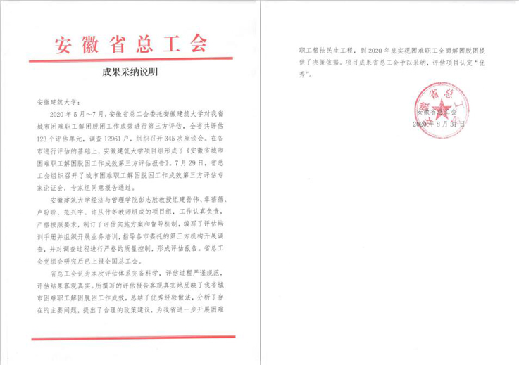 本网讯  近日,安徽省总工会对经管学院彭志胜教授团队完成的我省城市困难职工解困脱困工作成效第三方评估项目,组织召开结题论证会。专家组一致认为,该项目组撰写的评估报告客观真实地反映了我省城市困难职工解困脱困工作成效,总结了优秀经验做法,分析了存在的主要问题,提出了合理的政策建议,为我省进一步开展困难职工帮扶民生工程,到2020年底实现困难职工全面解困脱困提供了决策依据,同意通过结题。目前,项目成果已经被省总工会予以采纳,并认定为“优秀”。