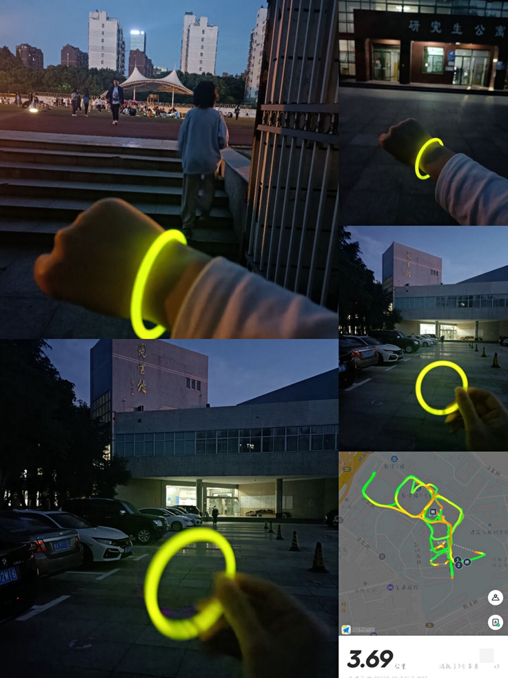 夜跑活动共设立了七处打卡点,参与者只需在其中任意四处进行拍照打卡即可完成。活动没有形式限制,快跑、慢跑皆可,伴随一声开跑口令,参与者们戴着荧光眼镜、荧光发卡,手中挥舞着各色荧光棒,一场与青春同行的荧光夜跑就此开始。随着同学们的脚步,校园里逐渐亮起了点点荧光,校园被装点成一个星光闪耀的欢乐海洋,涌动的人群在校园内形成了一道道亮丽的风景线。在终点处,工作人员还为完成跑步的同学们准备了学院的专属吉祥物贴纸和书签。