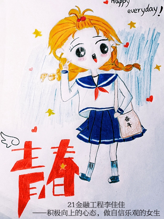 活动以“以梦为笔绘青春,阳光成长并肩行”为主题,面向学院全体女生征集有关“青春·女生”的绘画作品。面对青春,每个人都会拥有自己的专属记忆,无论是不安迷茫,还是欢快热烈,都是自己独一无二的青春体验。活动鼓励女生们拿起画笔,记录生活中的灵感瞬间,绘出自己心中的青春华章,以绘画的形式表达自己对梦想和快乐的向往和追求。活动中,21财管专业的林生玥同学用蓝色调创作出一个优雅的孔雀公主,将少女的恬淡美好与温柔气质展现得淋漓尽致,21会计王可然同学绘制了一个活力少女和保护着她的熊伙伴,体现出自己乐观开朗的性格和对大自然的热爱……一幅幅充满着蓬勃朝气的作品展现出女生们自信活泼、乐观向上的美好品质。