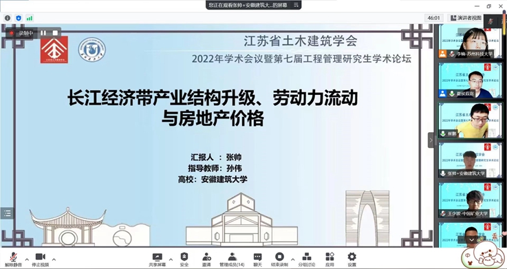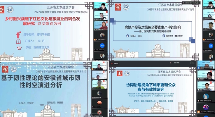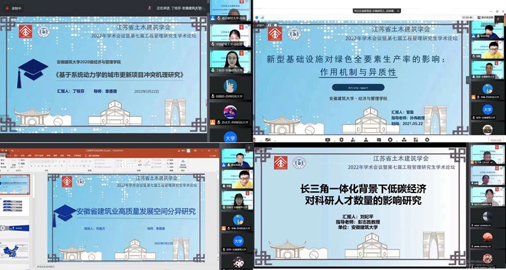 本网讯 2022年5月21-22日,江苏省土木建筑学会工程管理专业委员会、建筑与房地产经济专业委员会2022年学术会议暨第七届工程管理研究生学术论坛,在江苏苏州线上召开,会议主题是围绕“双碳”战略下住房和城乡建设的转型升级。我院潘和平、彭志胜、孙伟教授和章蓓蓓、杨苏老师以及20余名研究生参与了此次学术会议。