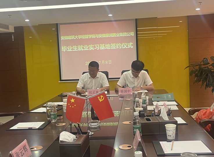 本网讯 为深入推进学生实习实践与就业工作,提升人才培养质量,搭建就业实习平台,7月9日,经管学院党委书记陈国中率队赴安徽豪润置业有限公司考察,就产学研合作进行了沟通与交流,并举行了签约与挂牌仪式。