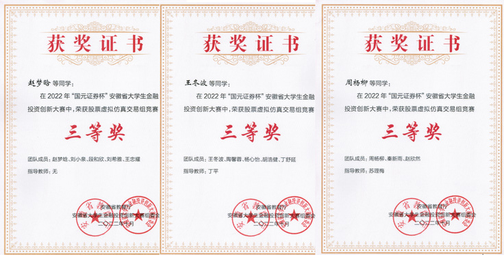 本网讯 近日,我院学子在安徽省教育厅主办的2022年“国元杯”安徽省大学生金融投资创新大赛中再获佳绩。经管学院董佳艳作为队长组建的团队获得省赛一等奖,刘莹、金敏、王冬波、周杨柳、赵梦晗等作为队长组建的团队分别获得省赛三等奖。