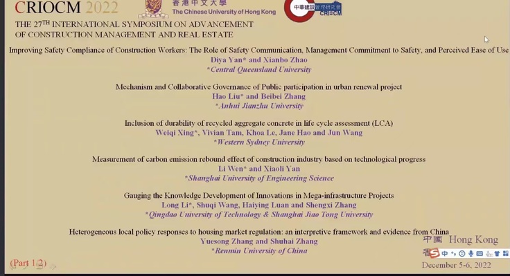 本网讯 2022年12月5-6日,第二十七届建设管理与房地产发展国际学术研讨会(CRIOCM2022)在线上成功举办。会议由中华建设管理研究会和香港中文大学联合主办,主题为“后疫情时代的建设管理和房地产:为健康生活建设智慧和韧性城市”。来自中国、澳大利亚、英国、美国等14个国家和地区的625位建设管理与房地产领域的专家及学者参与会议交流。