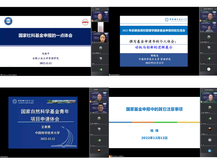 本网讯 12月12日,经管学院组织老师线上参加“2022年安徽省高校管理学国家基金申报经验交流会”,研讨会由安徽省管理学学会、中国科学技术大学文科建设办公室举办,中国科学技术大学管理学院、合肥工业大学管理学院和中国科学技术大学运筹学省级课程示范中心承办。2023年国家基金申报人员、青年博士等近20人参加。