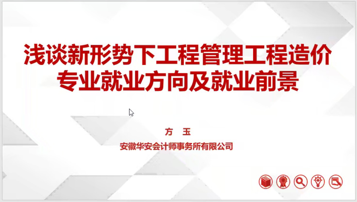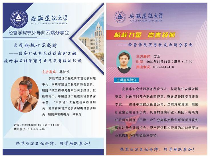 本网讯 2022年12月14日下午,经管学院举办校外导师与优秀校友云端分享会,邀请安徽省建设工程造价管理协会副理事长韩长发和安徽华安会计师事务所合伙人方玉两位专家做主题报告。此次分享会面向21工程管理、21工程造价专业的学生,系主任杨苏、学业导师张福顺和陈磊、相关专业系老师全程参与,报告会由副院长章蓓蓓主持。