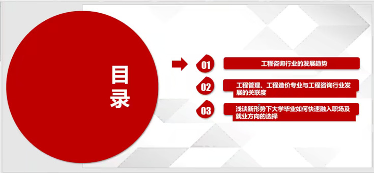 方玉以“浅谈新形势下工程管理工程造价专业就业方向及就业前景”为主题,对未来工程咨询行业的发展趋势以及两个专业与工程咨询行业发展的关系进行深入分析,分享了如何进行就业方向的选择以及如何快速融入职场的个人经验与思考。