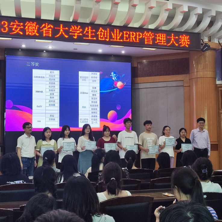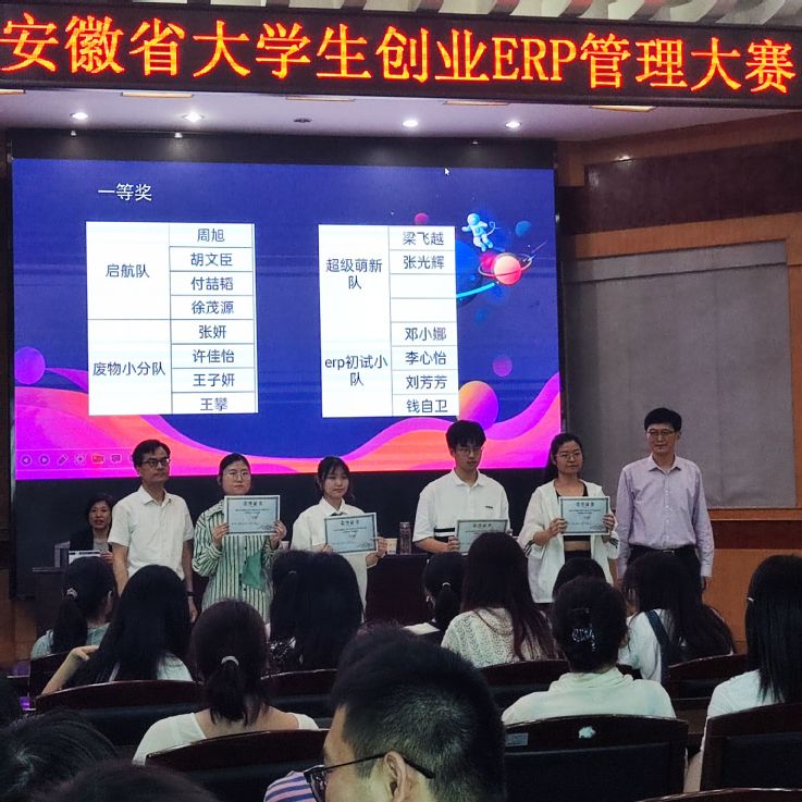 安徽省大学生创新创业ERP管理大赛属省级B类赛项,由安徽省教育厅主办,每年举办一次。大赛考验参赛队伍企业经营、市场分析、战略规划等综合素质,每支参赛队伍由4名队员组成,分别担任模拟企业的不同的职位,在为期4年的经营中共同运筹帷幄、抵御风险、发展壮大。