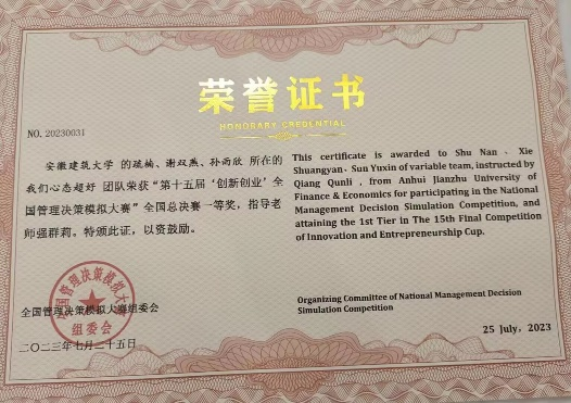本网讯 2023年7月24日,由全国管理决策模拟大赛组委会主办、江西财经大学承办的第十五届“创新创业”全国管理决策模拟大赛总决赛顺利落下帷幕。由学院强群莉教授指导,疏楠、谢双燕、孙雨欣三位同学组成的“我们心态超好”队表现优异,从全国96支队伍中脱颖而出,荣获全国总决赛一等奖,学校获得本届大赛的优秀组织奖。