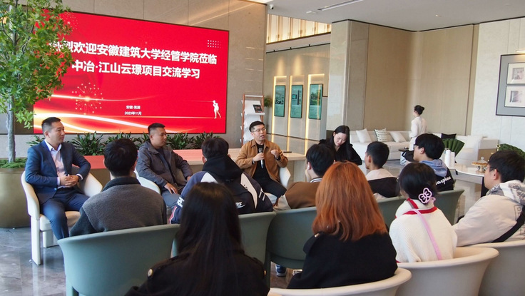 在中冶·江山云璟项目,工作人员对项目进行了详细介绍,带领师生参观了样板房。项目部还为师生们精心准备了房地产论坛对话,设计部部长洪亮亮、营销部部长陆蕾和工程部部长吴晓春围绕自身从业经历、房地产行业特点、房地产发展形势等与师生进行深入交流。