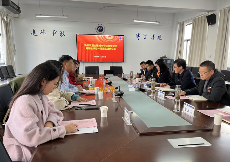 本网讯 为深入学习贯彻习近平新时代中国特色社会主义思想,以共建促党建、以党建促发展,充分发挥基层党组织的战斗堡垒作用,11月25日下午,经管学院党委与合肥市城建学院经管学院党总支在北区F楼404会议室开展党建共建活动。合肥市城建学院经管学院党总支书记周世敏,组织员、教工党支部书记张荣荣,学生支部书记吴园元、马招弟、刘玉林、奚翠萍,经管学院党政领导班子、学生党支部书记代表参加活动。