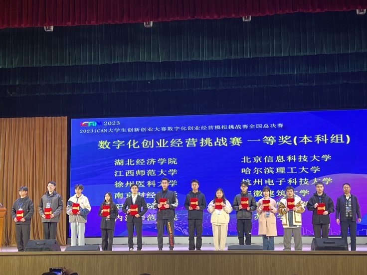 本网讯 11月25号,由中国信息协会主办,中国信息协会教育分会、江苏大学联合承办的2023年iCAN大学生创新创业大赛数字化创业经营模拟挑战赛全国总决赛落下帷幕。我校胡诚义、冯圣皓、叶欣怡以及彭慧娟、梁飞越、冯金特组成的两支队伍与来自哈尔滨工业大学(深圳)、华南理工大学、江苏大学等高校的109支队伍同台竞技,经过激烈角逐,在全国总决赛中勇夺一等奖和二等奖。