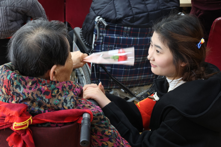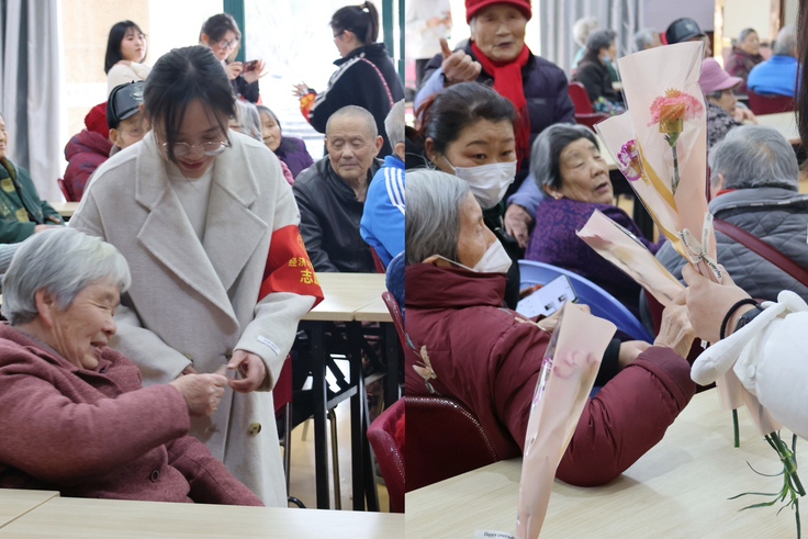 恰逢3.8妇女节来临之际,志愿者准备了康乃馨花束献给现场的奶奶们,并在老人耳旁送上祝福语。