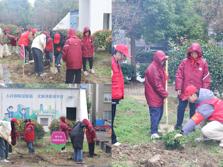临淮苑小区红色先锋林附近,草木萌芽尽显生机勃勃。两名志愿者们和两名小学生为一组,大家挥锹铲土、种下树苗、回填入坑、培实新土,种下一片桂花林,并插上爱护花草等宣传标识地牌。大家分工有序、配合默契,每道工序都一丝不苟地完成。为春光明媚的三月增添了盎然春意,用实际行动完美诠释了保护生态、和谐共存的美好理念。