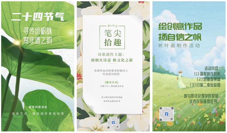 以文润心,以劳促行。开展以“绘创意作品 扬自信之帆”为主题的树叶画书签制作活动,学生们踊跃参与、积极行动,在校园中自行寻找材料,通过手工、绘画等方式制作文化书签。枝叶关情、珍藏美好。通过劳动实践,同学们近距离感受文化之美,将奇思妙想留存于书签中、寄存在书本里,进一步坚定文化自信、凝聚奋斗力量,用实际行动弘扬中华优秀传统文化。