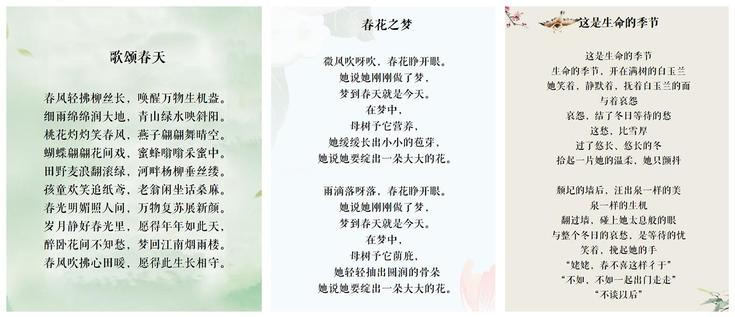 以文培元,以诗传情。在以“颂烟火诗意 焕文化之新”为主题的诗歌征集活动中,学生们围绕“晚春随笔”“花之告白”“自然与生命”等内容,创作了精彩生动的诗歌作品。诗行虽短,句句深情。同学们借此契机抒发了对未来的期许、对目标的笃定和对生活的热爱,用充满青春气息的创作、具有时代特征的表达展现经管学子昂扬向上的精神风貌,为中华优秀传统文化注入新活力、焕发新生机。