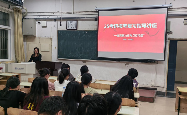 本网讯 为助力即将踏上考研征途的2025届学子们,帮助他们明确方向、坚定信心、科学备考,经管学院于9月25日举办考研报考复习指导讲座。讲座邀请了中公考研安徽研究院院长朱雨欣老师作为主讲嘉宾,她以其丰富的考研指导经验和深厚的专业知识,为现场近150名考研学子带来了一场精彩纷呈的分享。