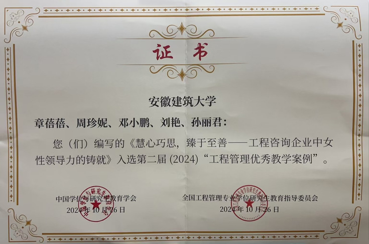 本网讯 2024年10月26日,由中国学位与研究生教育学会主办、教育部学位与研究生教育发展中心指导的第二届工程管理优秀案例获奖作品颁奖典礼在天津大学成功举办。我院章蓓蓓团队编写的案例《慧心巧思,臻于至善——工程咨询企业中女性领导力的铸就》(作者:章蓓蓓、周珍妮、邓小鹏、刘艳、孙丽君)荣获本届工程管理优秀案例并受邀参加颁奖典礼。