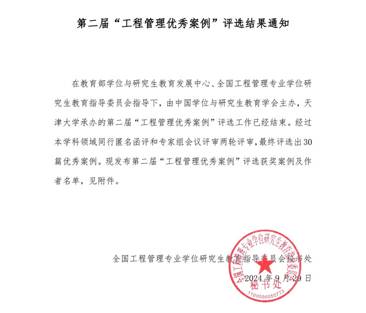 本次评选活动由全国工程管理专业学位研究生教育指导委员会学术指导,天津大学承办。评选过程遵循公开、公平、公正的原则,通过本学科领域同行匿名函评和专家组会议评审两轮评审,最终在全国范围内评选出30篇优秀案例。